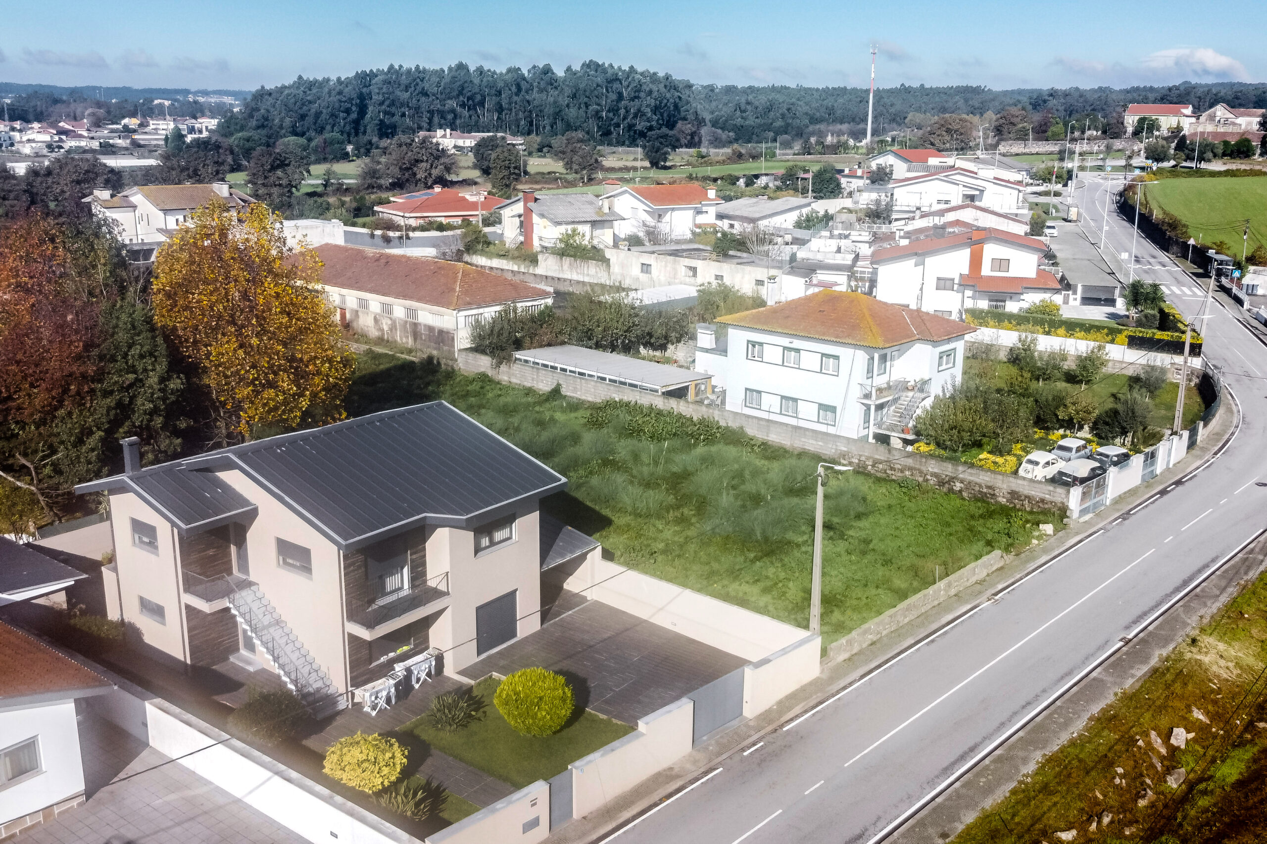 Este terreno para construção na Maia distingue-se pela versatilidade e pelas duas soluções possíveis de projeto — ambas alinhadas com a forte procura por moradias em Silva Escura e zonas residenciais premium no concelho.